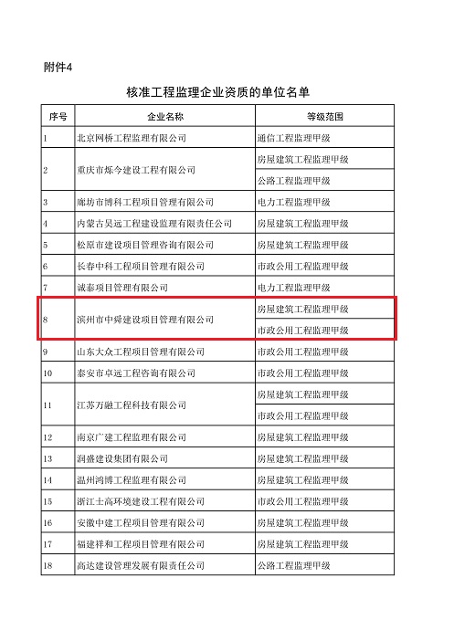 2019年4月2日,國家住房和城鄉(xiāng)建設部正式公布核準我公司房屋建筑工程監(jiān)理、市政公用工程監(jiān)理甲級資質(zhì)。此次資質(zhì)的成功升級是我公司資質(zhì)建設的又一個里程碑。 資質(zhì)升級成功后,公司在工程監(jiān)理領域?qū)⒂瓉砀鼜V闊的發(fā)展空間,也標志著我公司在監(jiān)理行業(yè)中將具備更高的水準。